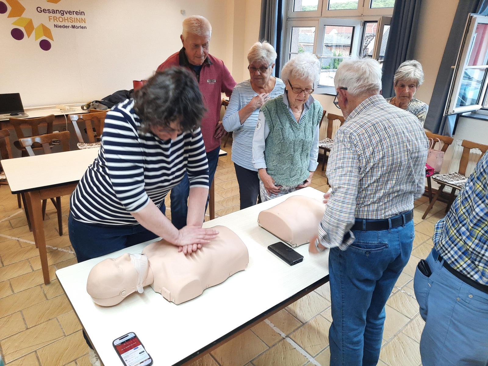 Der Chor des Gesangvereins Frohsinn Nieder-Mörlen ist nicht nur musikalisch aktiv, sondern lädt auch Interessierte ein um im Notfall – der hoffentlich nie eintreten wird – Menschenleben retten zu können. So erhielten die Anwesenden eine Auffrischung ihrer Kenntnisse im Bereich der Herz-Lungen-Wiederbelebung. Dafür war extra Andrea Lommel, Ausbilderin des Deutschen Roten Kreuzes in Bad Nauheim, in den Frohsinnsaal gekommen.
