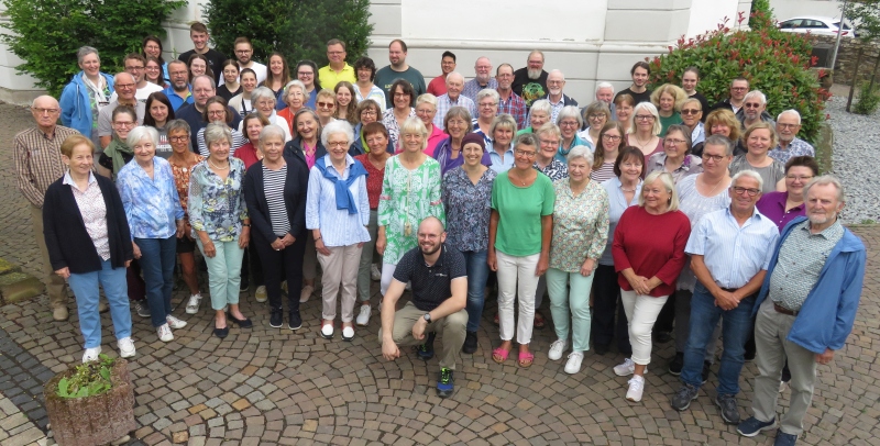 Chor- und Orchestermitglieder haben sich im Pfarrgarten versammelt und freuen sich auf das Konzert, das am 13. Juli in der katholischen Kirche Nieder-Mörlen erklingen wird.